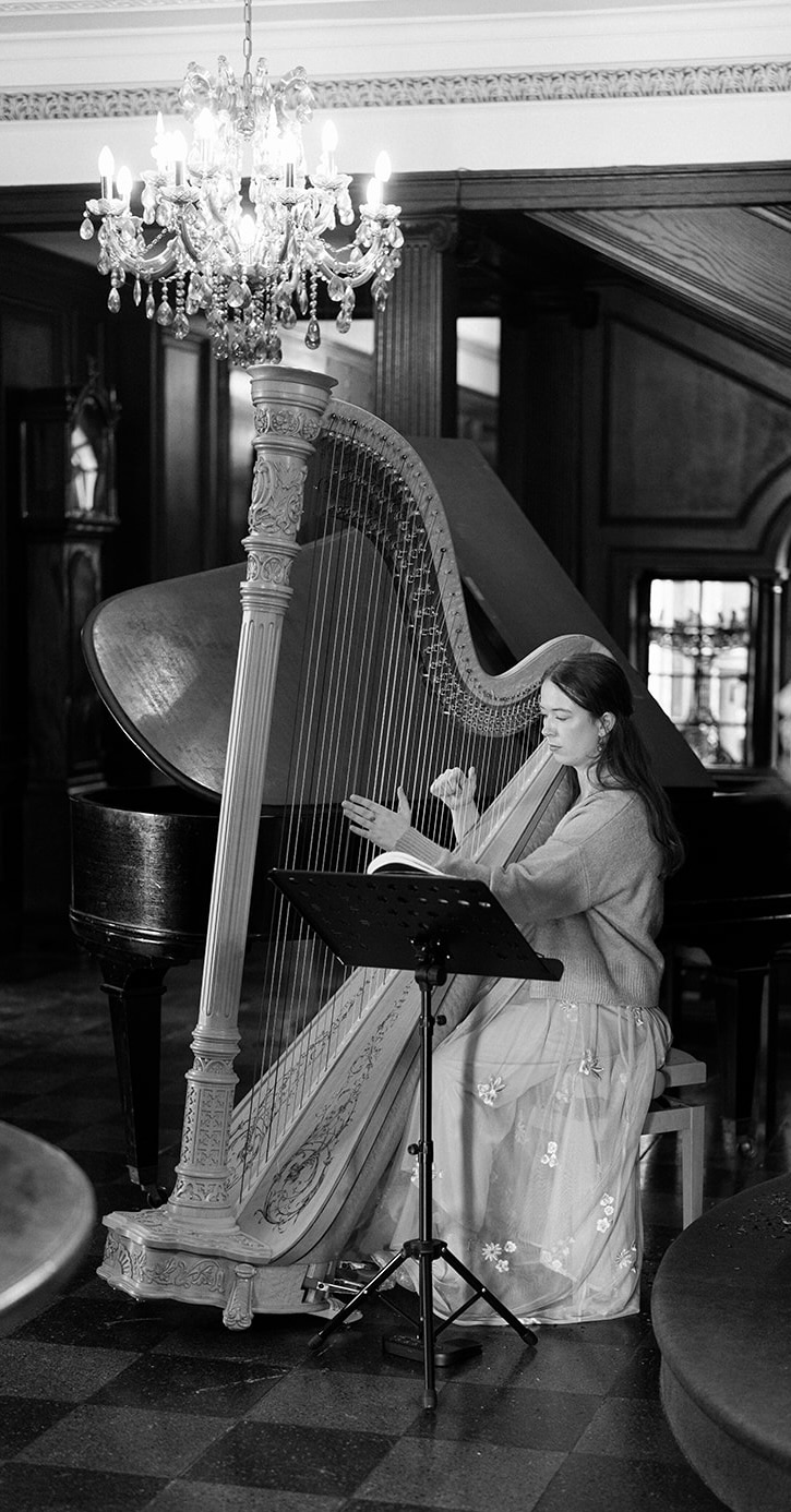 The harp sounds beautiful in any wedding venue but will sound its best in spacious rooms with hard surfaces. The sound of the harp can carry outdoors but will always sound louder indoors. It is possible to amplify the harp but as a carefully crafted, acoustic instrument it will produce the most beautiful sound when played without amplification. As an instrument that can be heard in a large concert hall it can be heard perfectly well during a busy reception, as well as providing the more ‘softly spoken’ moments that accompany the ceremony itself.